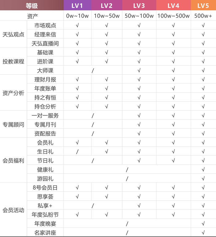 每个等级都精心准备了服务和权益,不同于其他平台权益偏向于红包卡券类福利,天弘的服务权益除了这些,更多围绕理财投资设计了很多服务。
