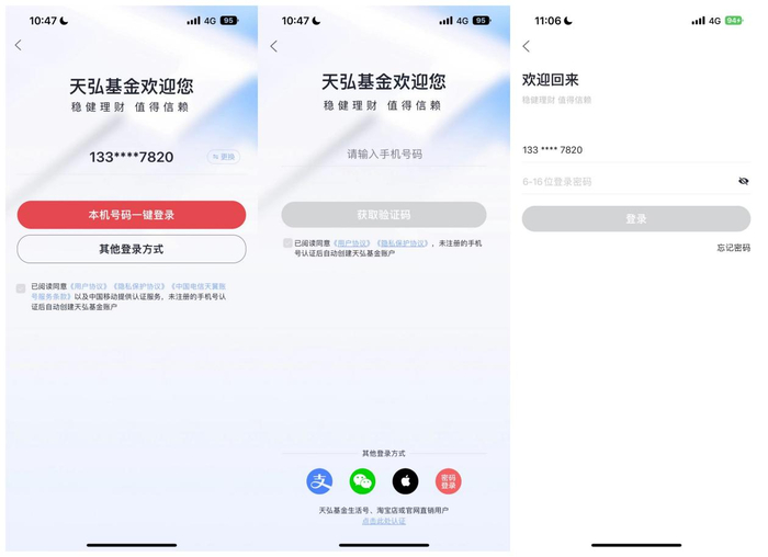 天弘基金APP新用户登录注册支持“本机号码一键登录”,相较于通过第三方注册登录方式更加便利。同时,也覆盖支付宝、微信、Apple ID、账号密码等其他登录方式。非首次登录时也支持使用手势图案、指纹、面容识别功能,兼顾了账户登录的安全性和便捷性。若用户想更换登录账号,APP也支持更换账号。此外,APP也提供了天弘基金生活号、淘宝店、官方直销用户登录入口。