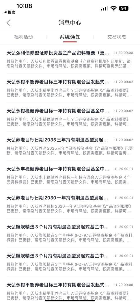 消息提醒方面,天弘基金APP“消息中心”整合了“福利活动、系统通知、交易状态”三大服务。其中,“福利活动”主要包括基金公司的活动、消息通知,含调查问卷、限时活动、直播提醒等。系统通知内主要包含自家基金产品的公告通知。而交易状态,可以将每笔交易实时通知到位——用户可以比较清晰地看到自己的相关交易。同时,在设置中APP消息通知支持个性化推送与个性化推荐设置。总体表现上,具有覆盖较为全面、实用性较高、及时性较强等优点。