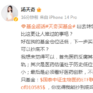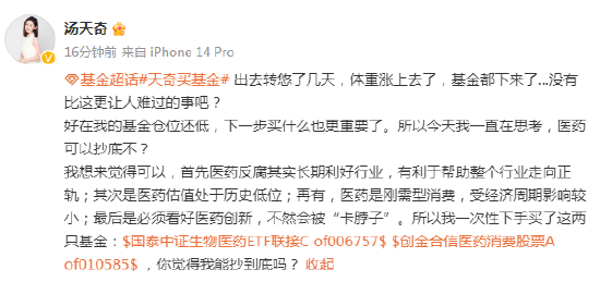 想1年赚30%买什么基金?微博基金首席体验官@汤天奇抄底国泰中证生物医药ETF联接C、创金合信医药消费股票A