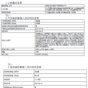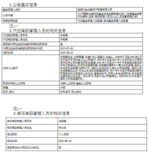 9月21日,渤海汇金证券资产管理 有限公司发布高级管理人员变更公告,总经理麻众志因个人原因离任,董事长齐朝晖代任总经理职务,任职日期2023-09-19。