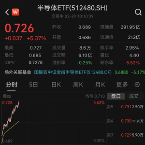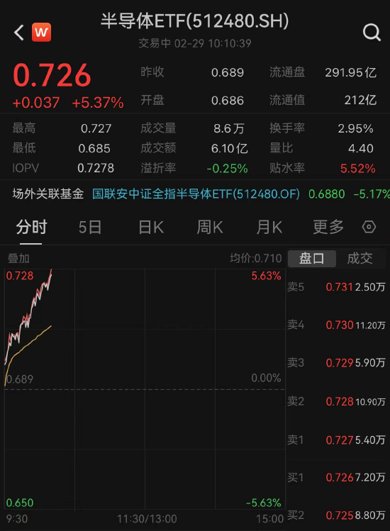 2月29日,半导体板块开盘直线拉起,昨日披露业绩快报的中微公司等设备龙头抢先走高,并带动半导体设备板块情绪回暖,截止发稿,半导体ETF(512480)大涨5.37%,成交额6.1亿元。