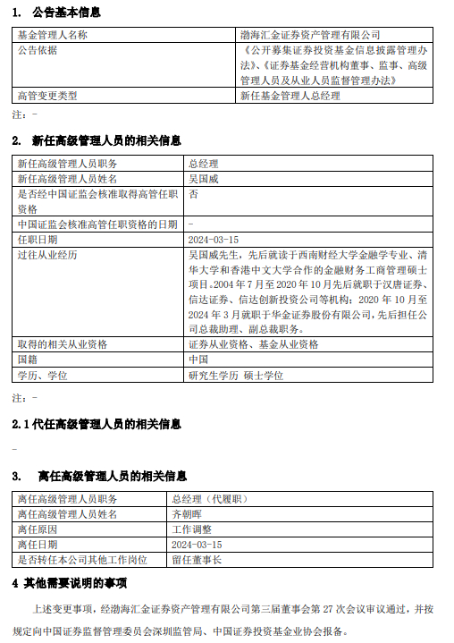 近日,渤海汇金证券资产管理有限公司发布高级管理人员变更公告,新任吴国威为总经理,任职日期2024-03-15。齐朝晖留任董事长,不再代履总经理职位。