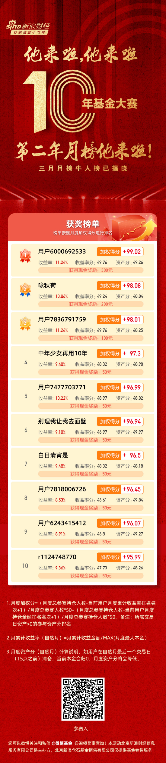 【十年基金大赛第二年】3月战报:TOP10中4位收益超10%!前十名瓜分1000元现金!(可订阅牛人实时调仓)