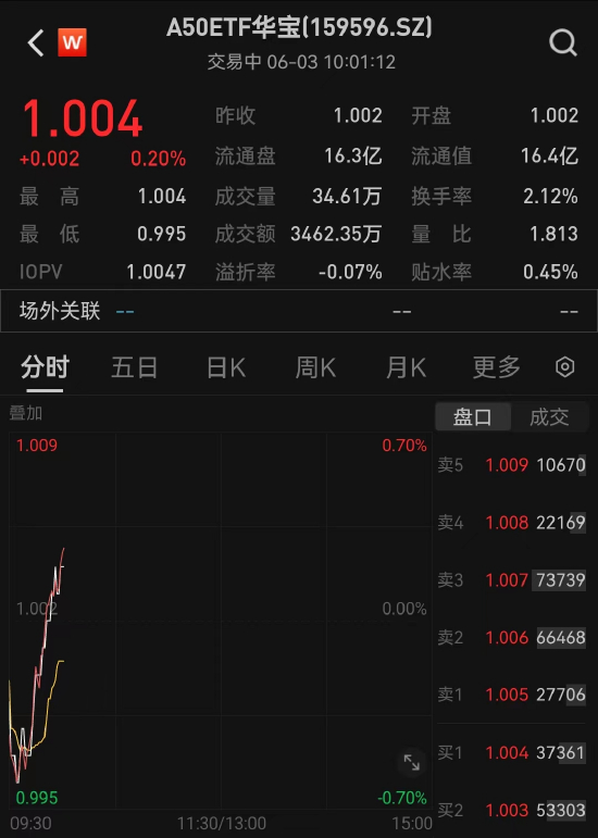 6月3日,截止10:01,A50ETF华宝(159596)涨0.2%,成交额3462.35万元。