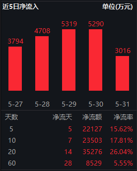 最新数据显示,A50ETF华宝(159596)已连续6个交易日获资金净申购,合计吸金超2.3亿元。(5月31日)单日再获3016万元资金净申购,近5日累计“吸金”超2亿元!近10日资金净流入合计超2.35亿元,近20日资金净流入合计3.53亿元,净流入率达26.04%。