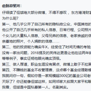 8月28日,有网友@醉游星河 在某平台公开夸赞东方港湾董事长但斌为名副其实的“中国私募第一人”,并给出四大理由: