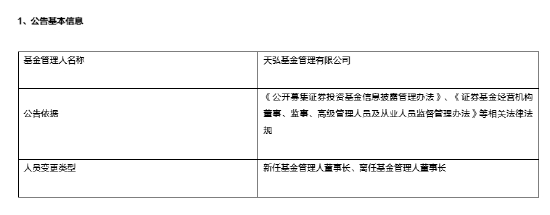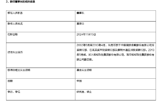 11月15日,天弘基金管理有限公司发布高级管理人员变更公告。公告显示,自11月15日起,黄辰立正式出任天弘基金董事长,原董事长韩歆毅因工作原因离任天弘基金董事长职务。