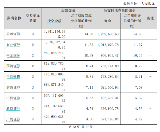 华宝医疗ETF(512170)上半年股票交易金额93亿元,佣金875万元,佣金费率万分之9.38,佣金费率在百亿股票ETF中排名第三。875万元佣金中,天风证券分得125万元,占比14%;兴业证券分得101万元,占比11.57%,中金公司分得90万,占比10.35%。