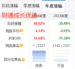 例如,财通成长优选A(001480)2024年赚48.62%,位居主动权益基金收益榜第六名!但是回顾2023年,财通成长优选A(001480)亏损30.49%,同类平均亏损9.01%,沪深300亏损11.38%,同类业绩排名2143/2331,排在同类末尾。当年跑输业绩基准25.8%。该基金近三年亏7%,网友评论:好期待回本,三年了!