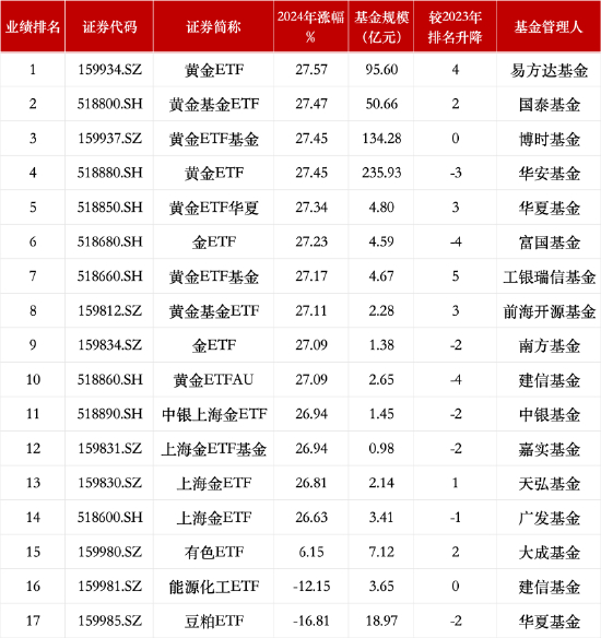 在前十大商品型ETF涨幅排名中,名列首位的是易方达基金旗下的黄金ETF,2024年上涨27.57%,基金规模95.60亿元,较2023年末业绩排名上升4名;国泰基金旗下的黄金基金ETF名列第二,2024年上涨27.47%,基金规模50.66亿元,较2023年末业绩排名上升2名;博时基金旗下的黄金ETF基金名列第三,2024年上涨27.45%,基金规模134.28亿元,较2023年末业绩排名无变化。