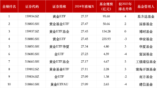 综合来看,规模前十大排名较2023年没有太大变化,华安黄金ETF、博时黄金ETF基金、易方达黄金ETF规模仍居前三,2024年末规模依次为235.93亿元、134.28亿元、95.60亿元;较2023年末规模增长依次为96.39亿元、57.49亿元、46.89亿元。