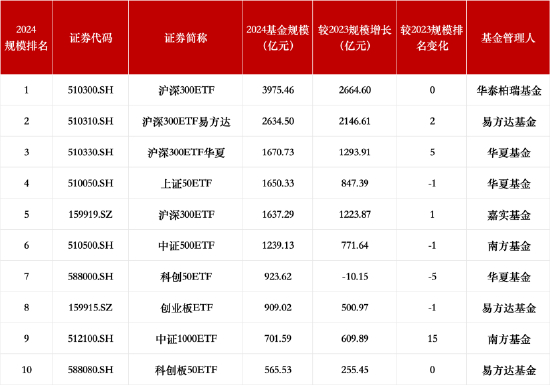 盘点2024股票型ETF规模排名:华泰柏瑞沪深300ETF稳居第一!华夏科创50ETF、华夏上证50ETF跌出前三