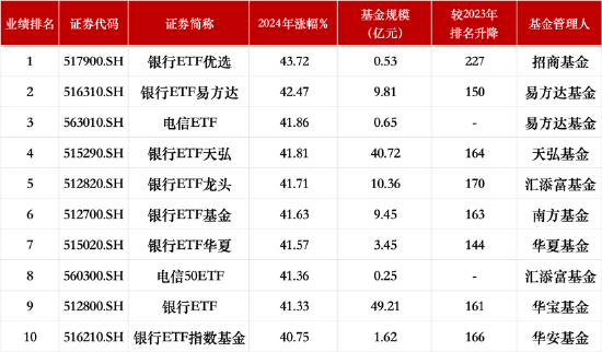 其中,名列首位的是招商基金旗下的银行ETF优选,2024年上涨43.72%,基金规模0.53亿元,较2023年末业绩排名上升227名;银行ETF易方达名列第二,2024年上涨42.47%,基金规模9.81亿元,较2023年末业绩排名上升150名;电信ETF名列第三,2024年上涨 41.86%,基金规模0.65亿元。