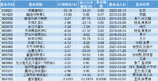 根据Wind数据,淳厚瑞明A的区间回报率为-35.19%,融通可转债C为-13.95%。前海开源基金旗下的前海开源可转债和前海开源鼎裕C的区间回报率分别为-8.27%和-6.13%。先锋基金旗下的先锋汇盈C和先锋博盈纯债C的区间回报率分别为-7.86%和-6.55%。金信民富A的区间回报率为-7.24%。更多详见下表: