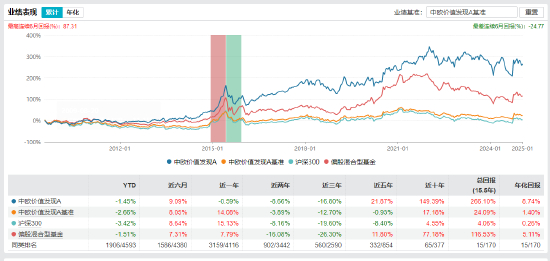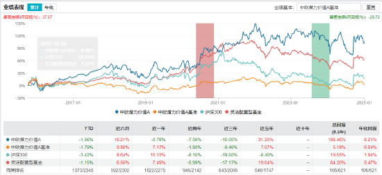 代表产品中欧价值发现成立于2009-07-24,截至2024-09-30,合计规模29.27亿元,基金经理:曹名长,蓝小康,沈悦,投资风格中盘价值风格型,比较基准:沪深300指数*80%+上证国债指数*20%。截至2025年1月16日,累计任期总回报266.10%,年化回报8.74%,跑赢同期沪深300指数,回报排名15/170,近三年回报-16.80%,跑赢同期沪深300指数表现,未跑赢业绩比较基准。