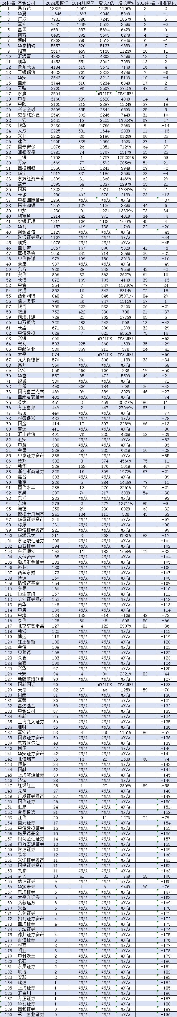 近日,基金公司2024规模排名出炉,与十年前的2014年末排名相比,基金行业发生了较大变化。