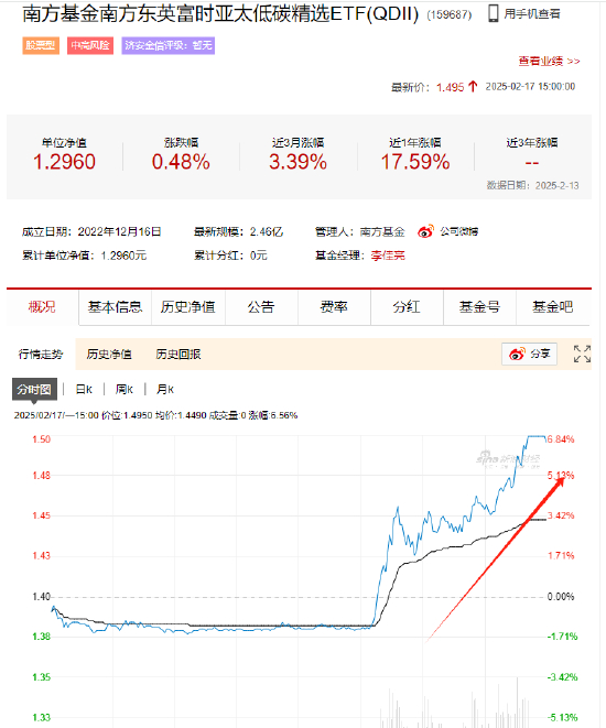 2月17日,南方基金亚太精选ETF(159687)午后放量拉升,大涨6.56%,溢价再超10%,成交额30.6亿元,换手率901%。