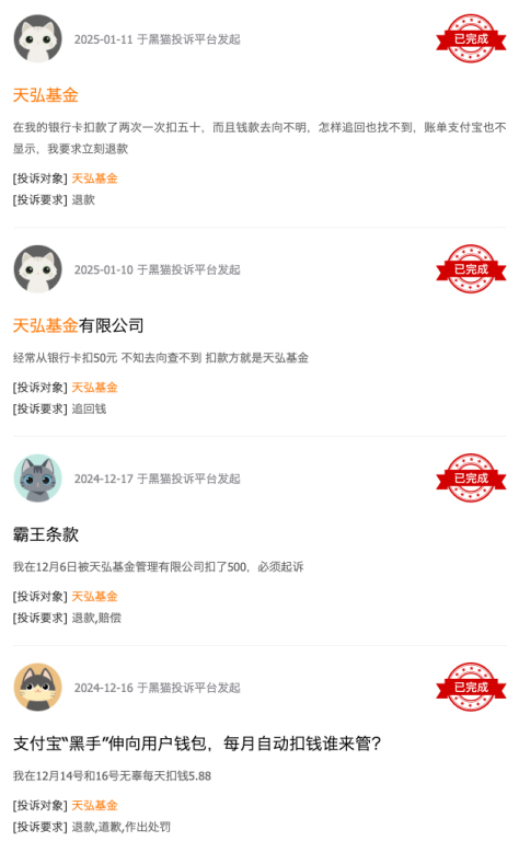 315在行动 | 天弘基金收到34起投诉,投诉内容主要为无故扣费且查不出明细