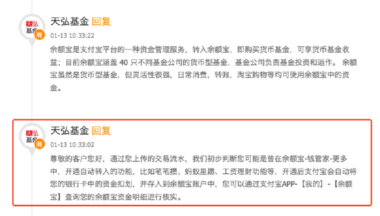 对此,天弘基金回复,“通过上传的交易流水,我们初步判断您可能是曾在余额宝-钱管家-更多中,开通自动转入的功能,比如笔笔攒、蚂蚁星愿、工资理财功能等,开通后支付宝会自动将您的银行卡中的资金扣划,并存入到余额宝账户中,您可以通过支付宝APP-【我的】-【余额宝】查询您的余额宝资金明细进行核实。”