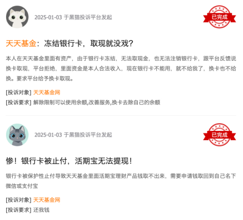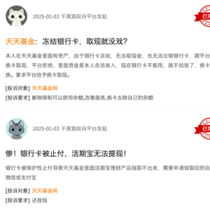 有投诉人表示,“本人在天天基金里面有资产,由于银行卡冻结,无法取现金,也无法注销银行卡,跟平台反馈说换卡取现,平台拒绝。里面资金是本人合法收入,现在银行卡不能用,就不给我了,换卡也不给换。要求平台给予换卡取现。”