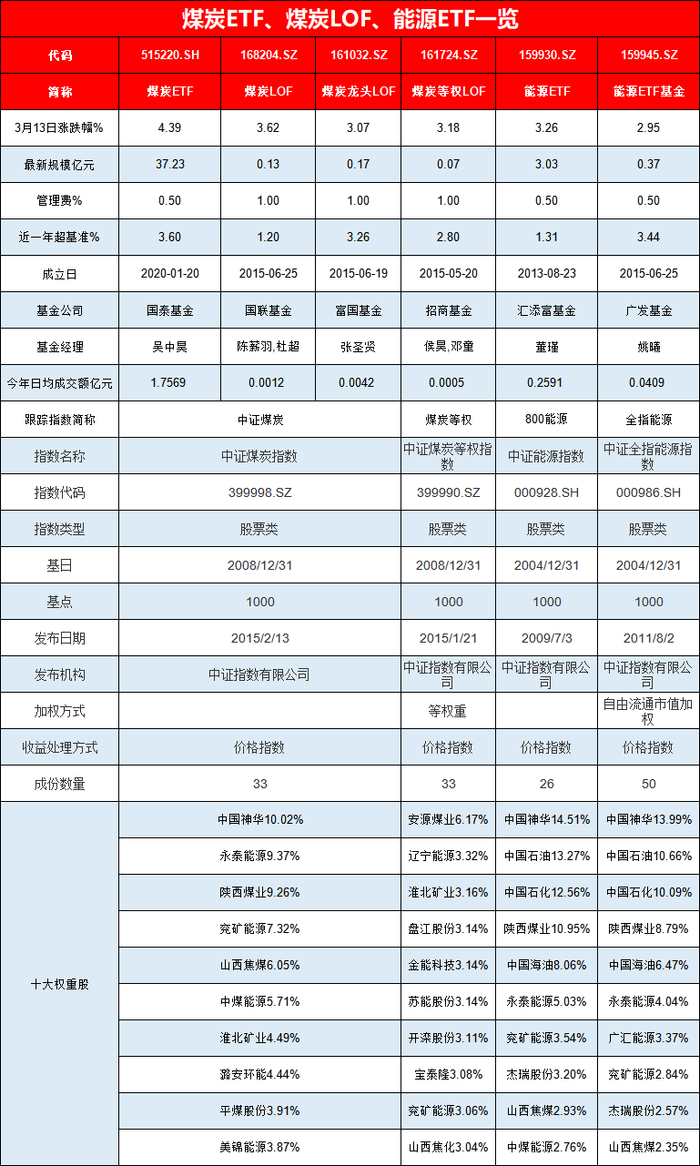 3月13日,煤炭板块强势领涨,多只相关基金单日涨幅超3%。在市场热度飙升的背景下,投资者面临选择难题:煤炭ETF、LOF、能源ETF等产品,究竟哪只更值得配置?本文从跟踪指数、规模、流动性、管理费率、超额收益五大核心维度展开对比,助您抓住投资机遇。