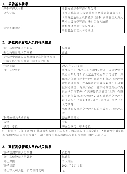 值得注意的是,原贝莱德基金总经理张弛出任浦银安盛基金总经理,资料显示,张弛先生于 1972 年 6 月出生。曾在中国建设银行股份有限公司和华安基金管理有限公司就职。后在光大保德信基金管理有限公司担任副总经理兼首席市场总监;在泰康资产管理有限责任公司担任副总经理、首席产品官、董事总经理及执行委员会成员等职务;在贝莱德投资管理(上海)有限公司担任董事总经理职务;在贝莱德基金管理有限公司担任代理董事长、董事、总经理、法定代表人等职务。现任浦银安盛基金管理有限公司董事、总经理之职。