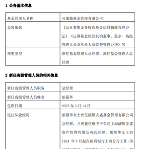 3月15日,贝莱德基金发布高级管理人员变更公告,总经理陈剑转任其他职务,新任郁蓓华为总经理,任职日期2025年3月14日。
