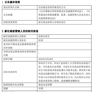 近日,长信基金发布关于基金行业高级管理人员变更公告,新任沈伟为首席信息官,任职日期2025年4月18日。