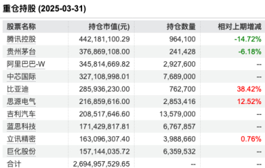 截止一季度末,腾讯控股、贵州茅台、阿里巴巴-W、中芯国际、比亚迪、思源电气、吉利汽车、蓝思科技、立讯精密、巨化股份为前十大重仓股。