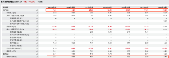 另一方面,易方达研究精选基金的财务表现令人堪忧。该基金在过去四年中连续亏损,其中2022年亏损高达31.01亿元,2023年亏损21.23亿元,2021年亏损19.84亿元,而去年也亏损了4.24亿元。尽管如此,该基金在这四年里累计收取了5.62亿元的管理费,具体分别为2024年0.61亿元、2023年1.01亿元、2022年1.52亿元以及2021年2.48亿元。随着浮动管理费改革方案的推行,预计冯波所收取的管理费可能会显著减少。