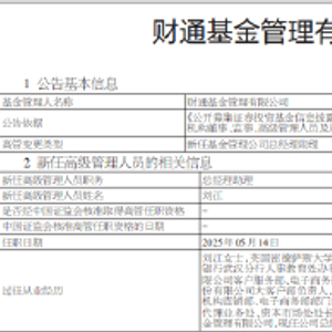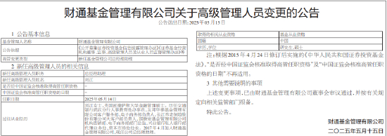 5月15日,财通基金发布高级管理人员变更公告,新任刘江为总经理助理,任职日期2025年05月14日。