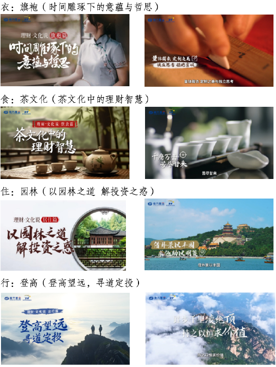 视频作品中,“旗袍”篇视频在中证中小投资者服务中心举办的《股东来了》(2024)“守护投资者·做时间的朋友”投保视频大赛中获铜奖;“中山装”篇视频入选“最佳形象IP”榜单;“茶文化”篇视频入选“最佳投教先锋”榜单。另有多篇图文被中国证券投资基金业协会及深圳基金同业公会的网站、公众号等平台转发。