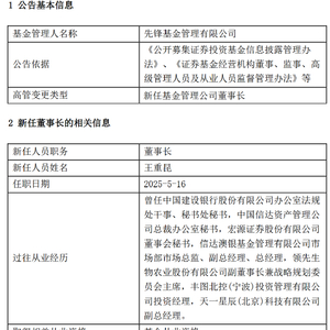 近日,先锋基金发布高级管理人员变更公司,新任王重昆为董事长,任职日期2025-5-16。此前4月30日发布董事变更的公告,2025 年 3 月至 4 月,经公司历次股东会审议通过,公司董事会成员调整为:王重昆、张帆、孙鸣、高海娜、邓峰、费安玲、杨亚。其中,邓峰、费安玲,杨亚为独立董事。