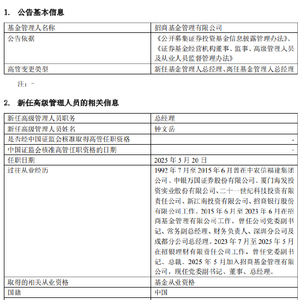 5月20日,招商基金发布高级管理人员变更的公告 ,总经理徐勇因个人原因离任,新任钟文岳为总经理,任职日期2025年5月20日。