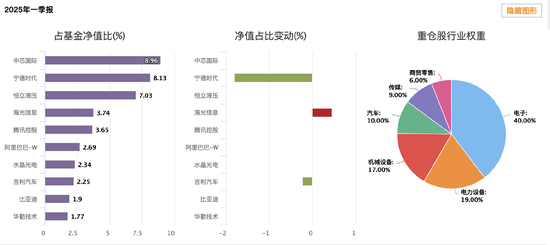 报告显示,行业集中于电力设备、电子、机械和汽车板块,前十大重仓股占比42.46%,中芯国际(8.96%)、宁德时代(8.13%)、恒立液压(7.03%)等龙头企业占据主导。(数据来源:2025年一季报)