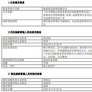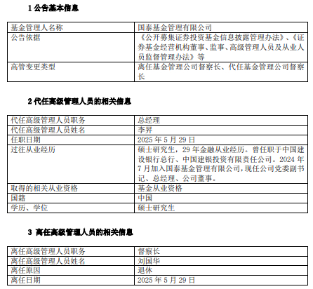 5月30日,国泰基金发布高级管理人员变更公告,督察长刘国华退休离任,由总经理李昇代任督察长职务,任职日期2025年5月29日。