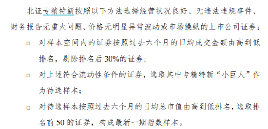 北证“专精特新”指数样本股需为已入选国家或省级“专精特新”企业名录的北交所上市公司。 在满足专精特新资质的基础上,对证券的流动性(如成交金额)设置一定要求,确保指数的可投资性。采用自由流通市值加权,同时设置个股权重上限(如10%),避免单一股票影响过大,分散风险。聚焦“小巨人”: 在满足条件的样本池中,国家级专精特新“小巨人”企业预计将获得优先或更高的权重考量,体现对“硬科技”龙头的倾斜。