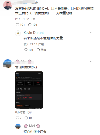 对于“重仓泡泡玛特的鹏华基金经理工位”图,网友热烈讨论,有的网友提出异议,认为没有任何护城河的公司,且不是刚需,且可以随时在技术上替代,为何重仓;也有网友支持“36杀进去,现在还持有 ,要懂潮玩”;也有网友质疑“最近这么跳 是资本要套现了啊”