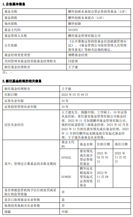 7月9日,鹏华创新未来(LOF)发布基金经理变更公告,新任王子建为基金经理,与闫思倩共同管理。王子建的加入,让自成立以来亏损近50%的鹏华创新未来百万投资者对其能否“扭亏为盈”以及能否带来新的投资思路充满期待。