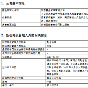 近日,同泰基金一纸公告引发行业关注:刘坚自7月18日起正式升任公司副总经理。这位去年底刚被提拔为总经理助理的投研骨干,在短短半年内再进一步,成为2025年公募基金“绩而优则仕”浪潮中的最新案例。