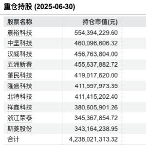 从持仓表现来看,二季度该基金重仓股大幅调整:与一季度相比,肇民科技、隆盛科技、北特科技、祥鑫科技、浙江荣泰、斯菱股份新进前十大重仓;双林股份、中大力德、华辰装备、捷昌驱动、兆威机电、绿的谐波则退出前十大重仓;并增持震裕科技、中坚科技、汉威科技、五洲新春,反映对智能制造核心环节的加码。