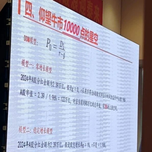 模型二稳定增长模型,2024年A股股分红金额为2.39万亿。假设股息增长率g=1%,r不变=1.96%,A股市值=2.39/(1.90%-1%)=265万亿,对应指数有194%上涨空间。