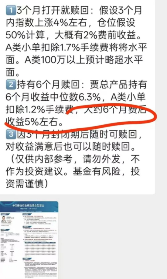 申万菱信行业精选混合基金的路演截图显示,渠道销售做了诸多收益假设。第一,若3个月打开就赎回,假设3个月内指数上涨4%左右,仓位按50%计算,大概有2%费前收益,A类小单扣除1.7%手续费将将持平,A类100万以上预计略超持平线。第二,若持有6个月赎回,贾总产品持有6个月收益中位数6.3%,A类小单扣除1.2%手续费,大约6个月费后收益5%左右。第三,因三个月封闭期后随时可赎回,对收益满意后也可以随时赎回。