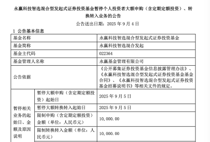 而就在当天上午,基金管理人永赢基金宣布自9月5日起,对该产品实施限购,个人投资者单日单账户大额申购(含定投)、转换转入限额由此前的100万元调降至1万元,机构投资者则不受限制。