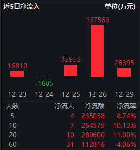 资金流向显示,创业板50ETF(159949)近期持续获得资金青睐。近5个交易日净流入23.5亿元,近20个交易日净流入28.1亿元,近60个交易日累计净流入11.3亿元。截至12月29日,该ETF流通规模为294.22亿元。