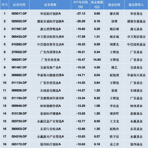 值得注意的是,在年度回报表现最弱的区间内,全市场跌幅排名前三十的主动权益类基金,其年内回报率均低于-9.75%,其中多只产品亏损超过15%,华富医疗创新A更以-27.13%的回报位居跌幅榜首,浦银安盛医疗创新A、鑫元消费甄选A紧随其后。