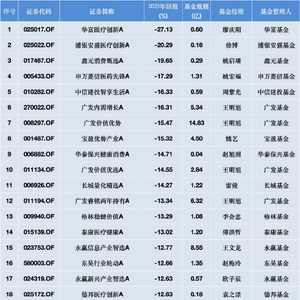 值得注意的是,全市场跌幅排名前三十的主动权益类基金,其年内回报率均低于-9.75%,其中多只产品亏损超过15%,华富医疗创新A更以-27.13%的回报位居跌幅榜首,浦银安盛医疗创新A、鑫元消费甄选A紧随其后。