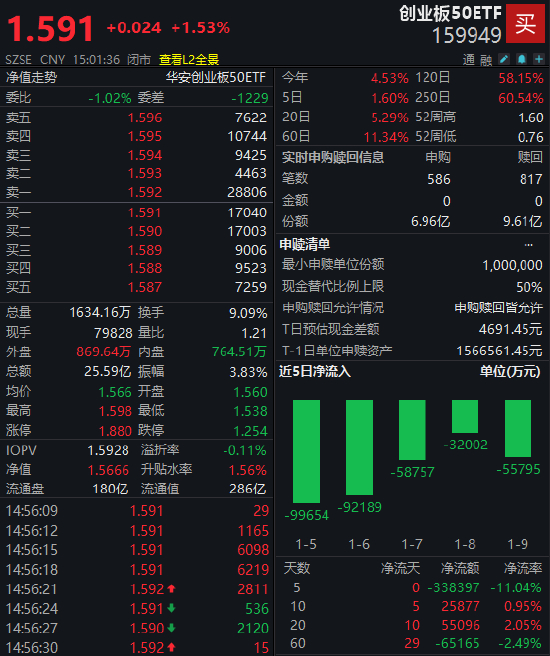 1月12日,A股三大指数全线收涨,涨幅均超1%,其中沪指实现17连阳;创业板指早盘一度下跌逾1%,随后探底回升,收盘翻红。在此背景下,华安创业板50ETF(159949)上涨1.53%,报收1.591元,换手率达9.09%,成交额25.59亿元,位列同类标的ETF之首。