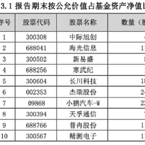 持仓数据显示,四季度末其前十大重仓股合计占基金资产净值比例高达66.51%。其中,中际旭创、海光信息、新易盛、寒武纪四只核心算力标的占据了前四位,合计占比超过34%。
